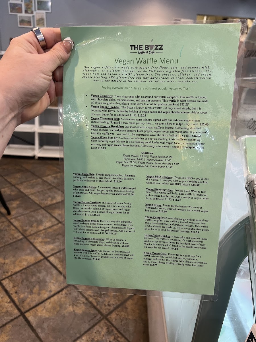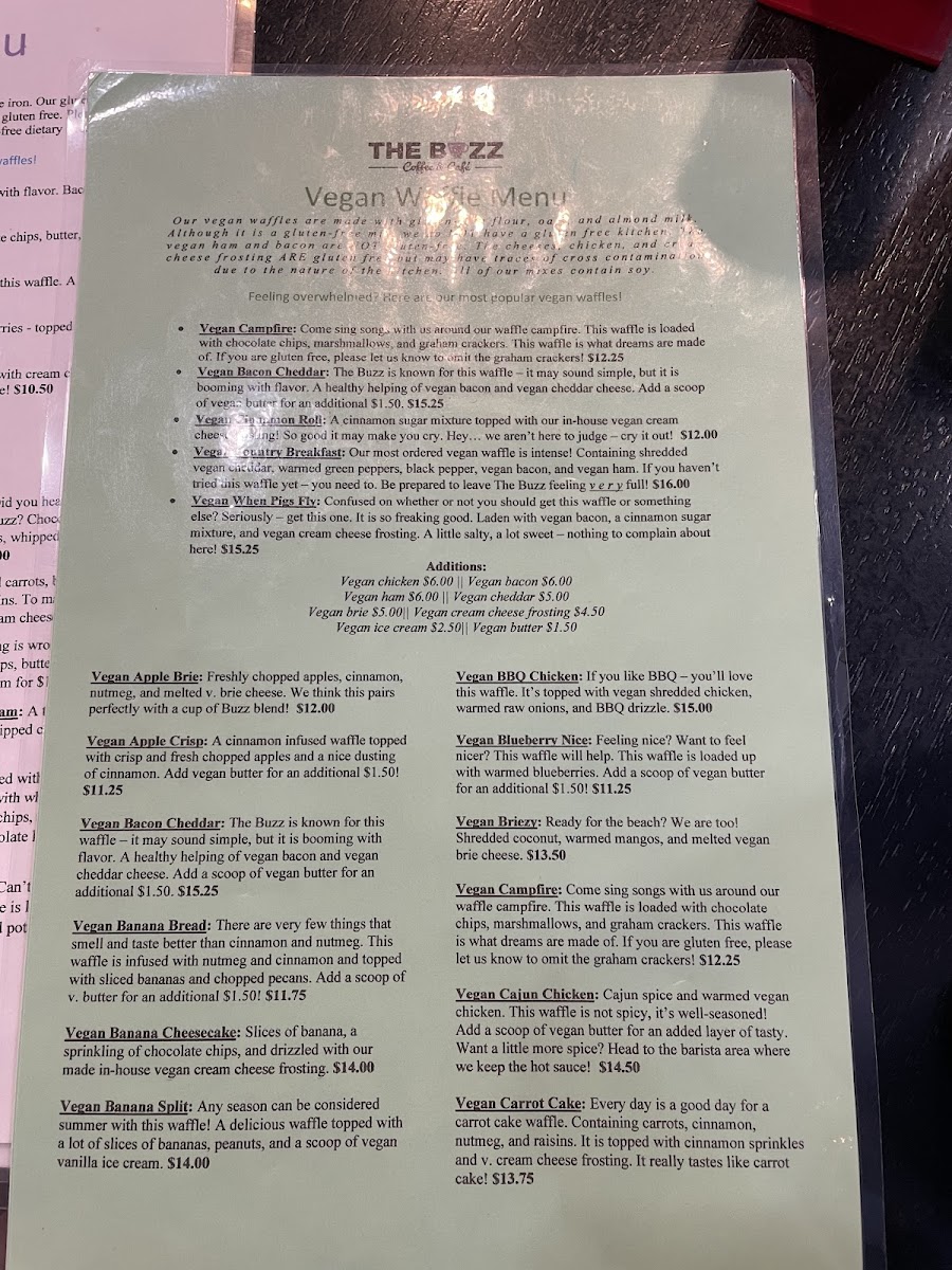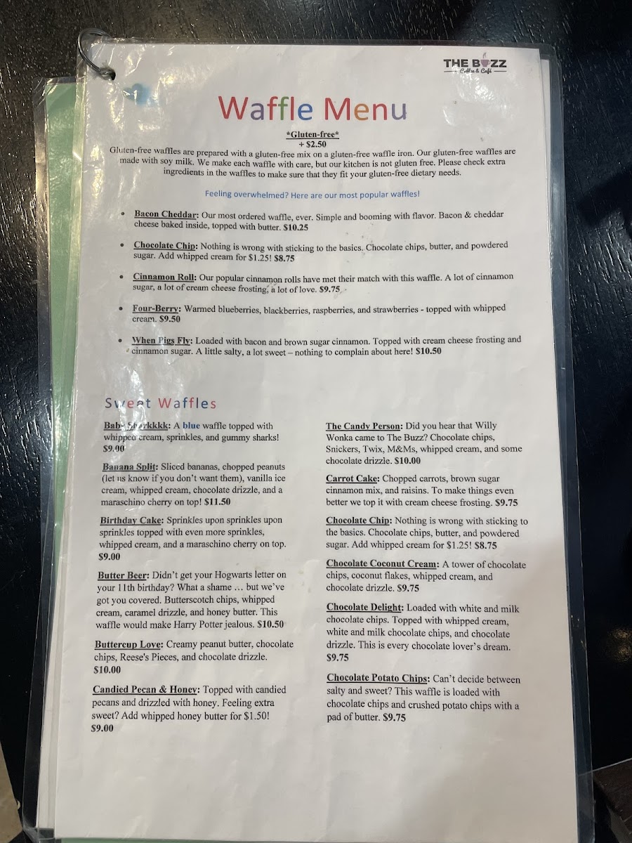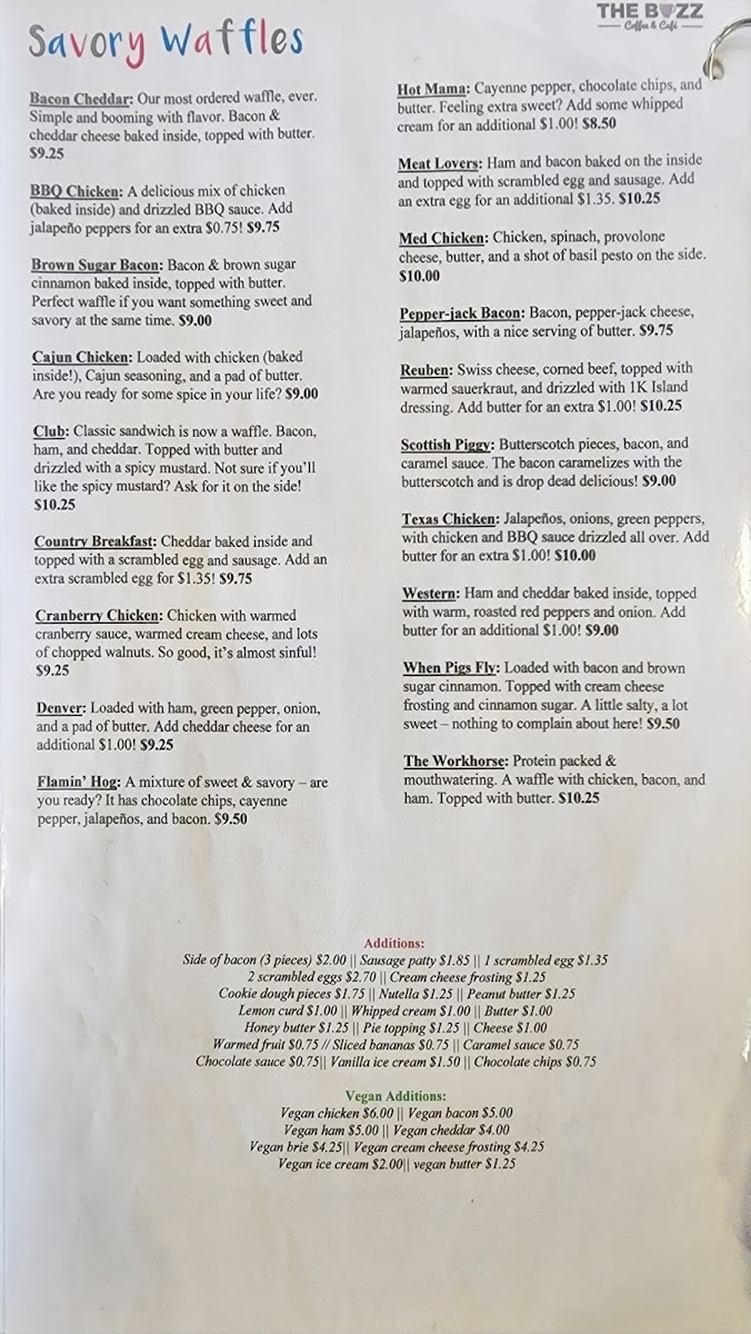 The menu highlights a diverse selection of waffles, ranging from sweet options like Lemon Pie or White Chocolate Raspberry to savory choices such as Bacon Cheddar. These waffles are often paired with rich, aromatic coffee drinks—including cold brews and flavored mochas—making them perfect for a leisurely breakfast or a satisfying afternoon break.