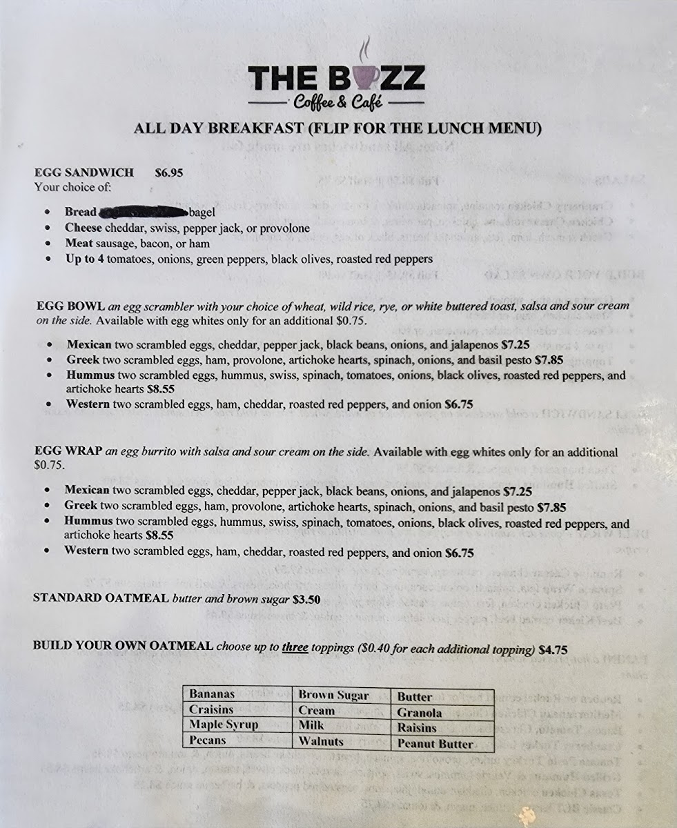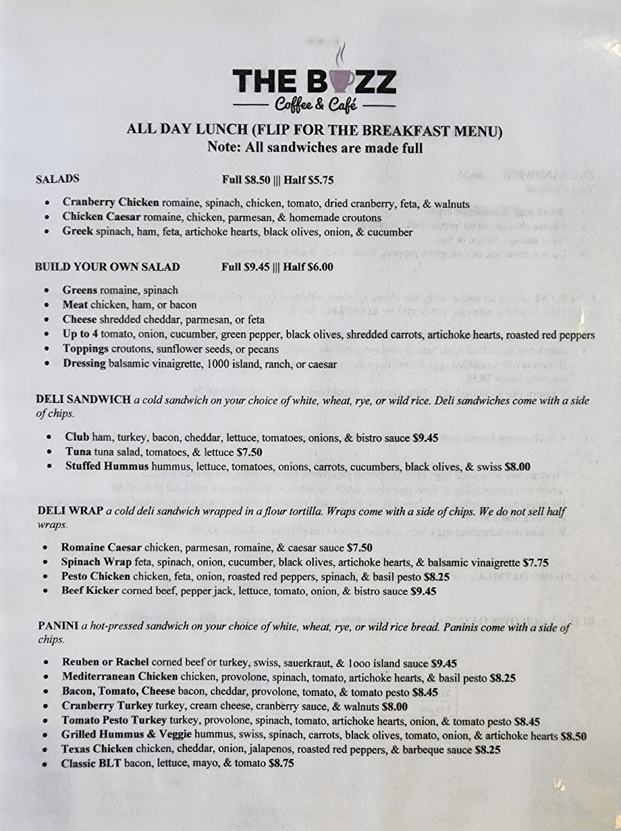 The Buzz Coffee & Cafe offers a menu that blends simple café fare with casual, comforting bites. Here, you’ll find a variety of breakfast options, bakery treats, and deli-style sandwiches designed to suit a relaxed morning or midday stop. Whether you’re in the mood for a thoughtfully crafted espresso or a hearty sandwich, the offerings feel approachable and easy to enjoy in a cozy, friendly setting.